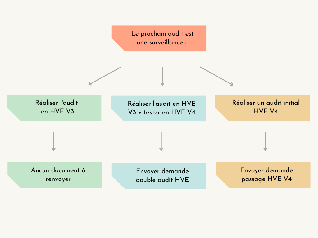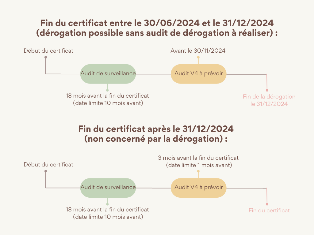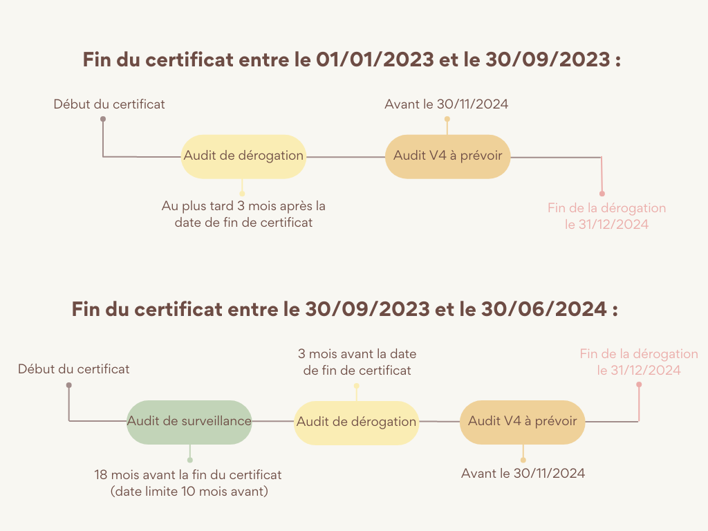 Les démarches seront différentes pour chaque situation, nous avons étudié le nouveau dispositif selon les options qui s'offrent à vous, que votre audit soit une surveillance ou qu'il porte sur un renouvellement, et selon la date de fin de votre certificat.
